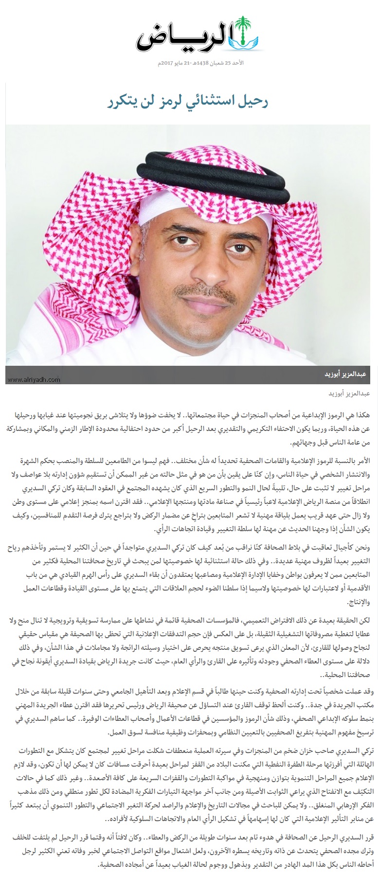 الأمر بالنسبة للرموز الإعلامية والقامات الصحفية تحديداً له شأن مختلف.. فهم ليسوا من الطامعين للسلطة والمنصب بحكم الشهرة والانتشار الشخصي في حياة الناس، وإن كنّا على يقين بأن من هو في مثل حالته من غير الممكن أن تستقيم شؤون إدارته بلا عواصف ولا مراحل تغيير لا تثبت على حال، تلبيةً لحال النمو والتطور السريع الذي كان يشهده المجتمع في العقود السابقة وكان تركي السديري انطلاقاً من منصة الرياض الإعلامية لاعباً رئيسياً في صناعة مادتها ومنتجها الإعلامي.. فقد اقترن اسمه بمنجز إعلامي على مستوى وطن ولا زال حتى عهد قريب يعمل بلياقة مهنية لا تشعر المتابعين بتراخٍ عن مضمار الركض ولا بتراجع يترك فرصة التقدم للمنافسين، وكيف يكون الشأن إذا وجهنا الحديث عن مهنة لها سلطة التغيير وقيادة اتجاهات الرأي.