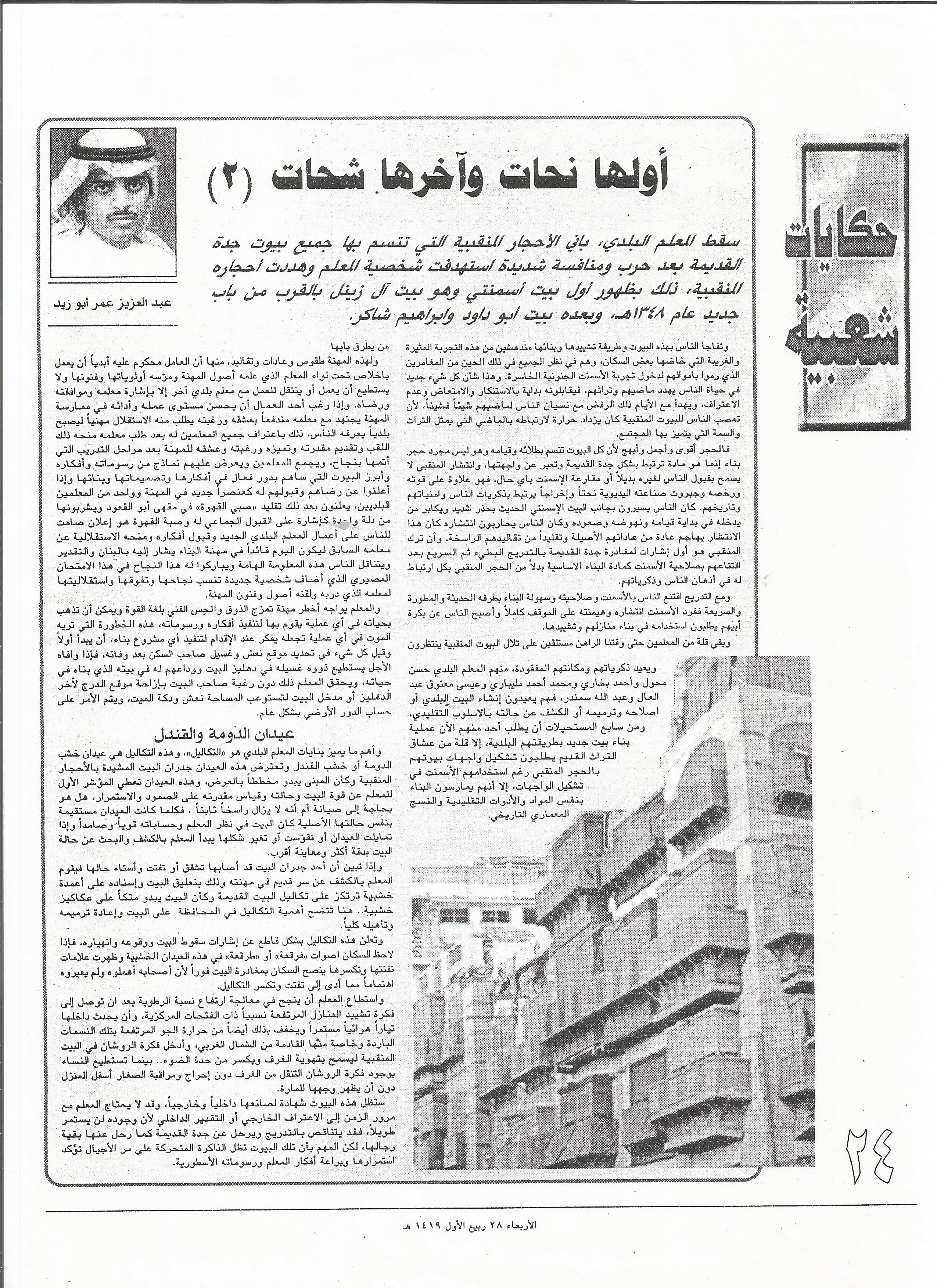 سقط المعلم البلدي ، باني الأحجار المنقبية التي تتسم بها جميع بيوت جدة القديمة بعد حرب و منافسة شديدة استهدفت شخصية المعلم و هددت أحجاره المنقبية ، ذلك بظهور أول بيت إسمنتي و هو بيت آل زينل بالقرب من باب جديد عام 1348هـ ، و بعده بيت أبو داوود و إبراهيم شاكر .